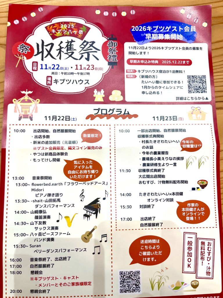 11月後半に初めて滝沢泰平さんのキブツ八ヶ岳に行ってきました。 今年は私自身の活動が忙しくなかなか訪れることができずにいましたが、収穫祭のご連絡を頂いた時に「無理してでも行かねば!」と決意し、音楽祭参加の希望を出したところ快諾してくださり、イベントの合間にハマった収穫祭に参加するために車で一人旅を決行しました。初めて訪れた八ヶ岳でした。